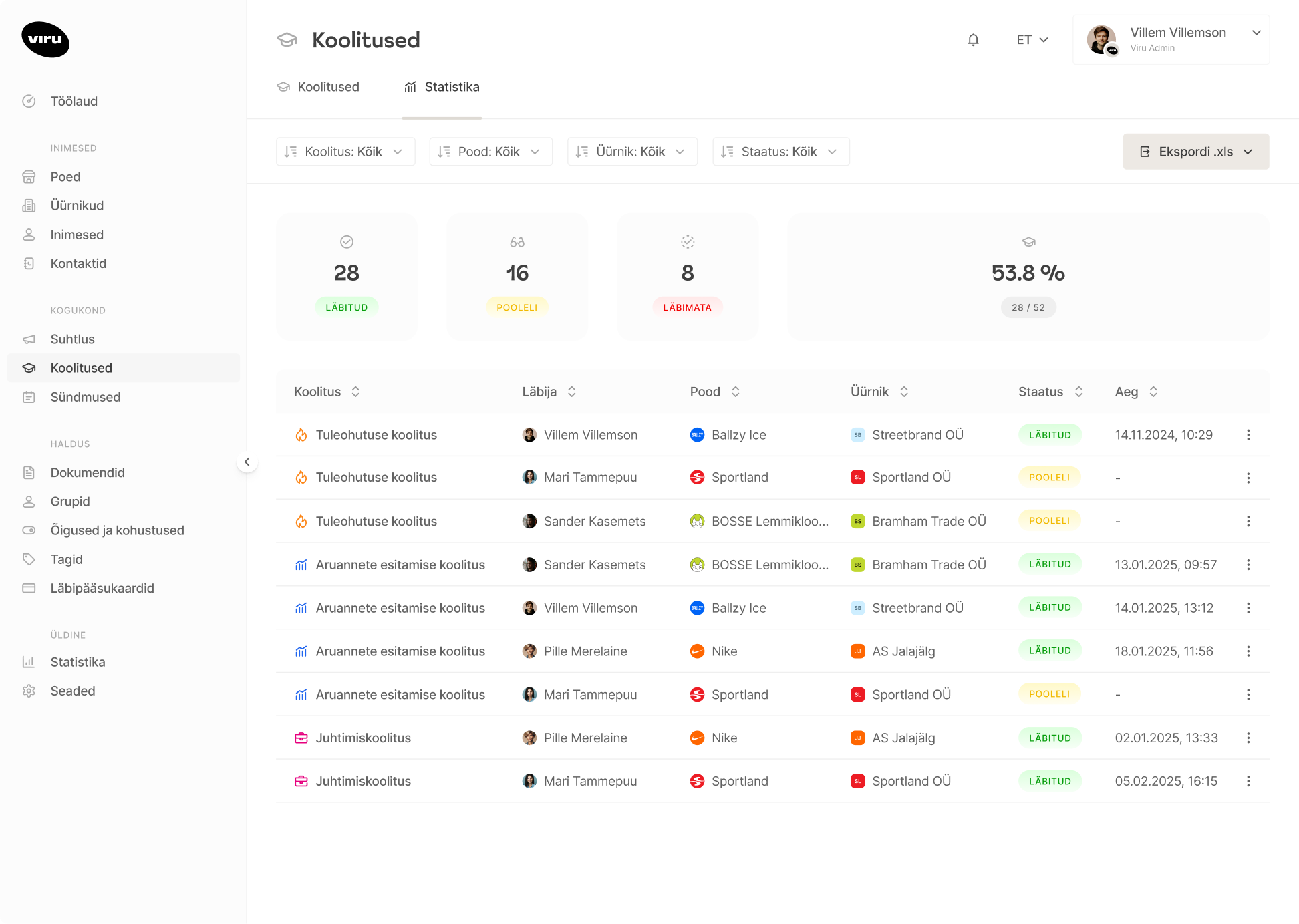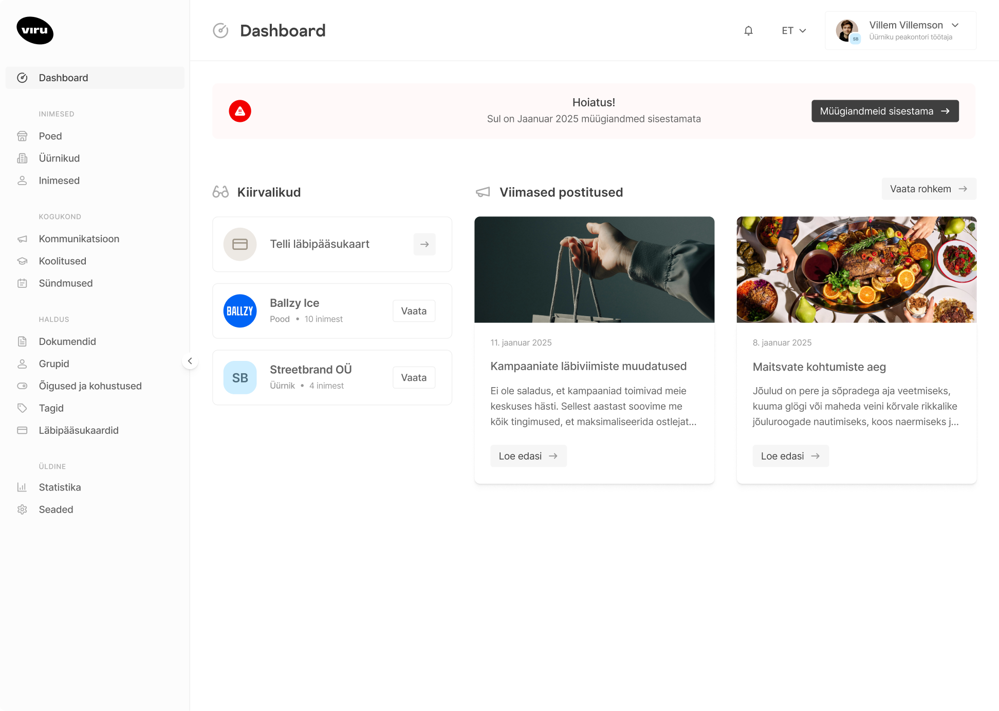 We developed a comprehensive internal platform and management system for Viru Keskus to support the daily operations of a modern shopping center. Built on a single source of truth concept, the platform allows center management to oversee tenants, employees, and access cards, and to communicate directly with all stakeholders. For employees, everything is accessible in one place – from submitting sales data and completing trainings to accessing documents and staying informed about internal events.